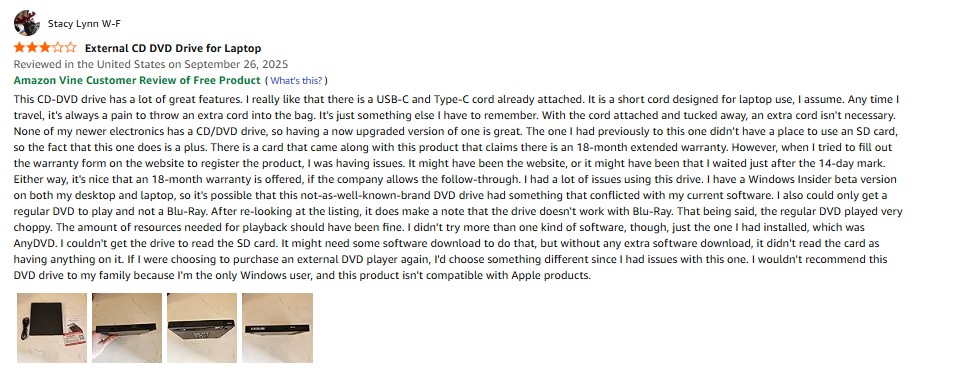 I purchased the Kadlun External CD DVD Drive for Laptop, USB 3.0 Optical Disc Drive,4 USB Ports and 2 TF/SD Card Slots, Portable CD/DVD Burner CD ROM External DVD Drive for Laptop Desktop PC Windows 11/10/8/7/XP Linux Mac OS from Amazon and it was delivered in a timely fashion. This CD-DVD drive has a lot of great features. I really like that there is a USB-C and Type-C cord already attached. It is a short cord designed for laptop use, I assume. Any time I travel, it's always a pain to throw an extra cord into the bag. It's just something else I have to remember. With the cord attached and tucked away, an extra cord isn't necessary. None of my newer electronics has a CD/DVD drive, so having a now upgraded version of one is great. The one I had previously to this one didn't have a place to use an SD card, so the fact that this one does is a plus. There is a card that came along with this product that claims there is an 18-month extended warranty. However, when I tried to fill out the warranty form on the website to register the product, I was having issues. It might have been the website, or it might have been that I waited just after the 14-day mark. Either way, it's nice that an 18-month warranty is offered, if the company allows the follow-through. I had a lot of issues using this drive. I have a Windows Insider beta version on both my desktop and laptop, so it's possible that this not-as-well-known-brand DVD drive had something that conflicted with my current software. I also could only get a regular DVD to play and not a Blu-Ray. After re-looking at the listing, it does make a note that the drive doesn't work with Blu-Ray. That being said, the regular DVD played very choppy. The amount of resources needed for playback should have been fine. I didn't try more than one kind of software, though, just the one I had installed, which was AnyDVD. I couldn't get the drive to read the SD card. It might need some software download to do that, but without any extra software download, it didn't read the card as having anything on it. If I were choosing to purchase an external DVD player again, I'd choose something different since I had issues with this one. I wouldn't recommend this DVD drive to my family because I'm the only Windows user, and this product isn't compatible with Apple products. amazon listing.