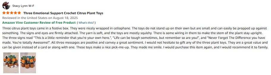 I purchased the Goaanz Mini Emotional Support Crochet Inspirational Birthday Gifts 3PCS, Handmade Positive Crochet Animals with Card, Thank You Gifts for Women Men Coworkers Teacher Friends Home Office Decor from Amazon and it arrived quickly. Three citrus plant toys came in a festive box. They were nicely wrapped in cellophane. The toys do not stand up on their own, but are small and can easily be propped up against something. The signs and eyes are firmly attached. The yarn is soft, and the toys are mostly squishy. There is some wiring in them to make the stem of the plant stay upright. The three signs read "This is a little reminder that you're your own hero.", "Life can be tough sometimes, but remember so are you!", and "Never Forget The Difference you have made. You're totally Awesome!". All three messages are positive and convey a great sentiment. I would not hesitate to gift any of the three plant toys. They are a great value and can be given instead of a card or along with one. These toys make a nice pick-me-up. They made me smile. I would purchase this item again, and I would recommend it to family. amazon listing.