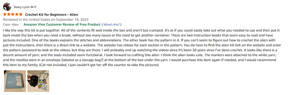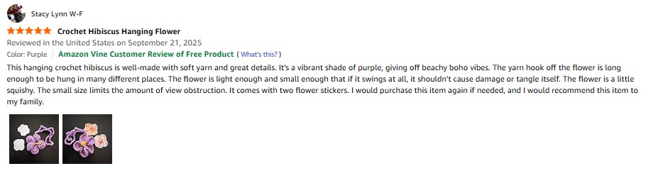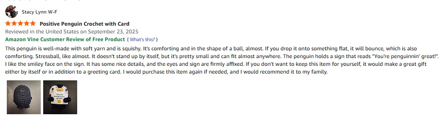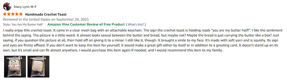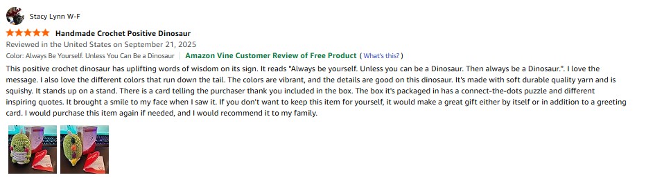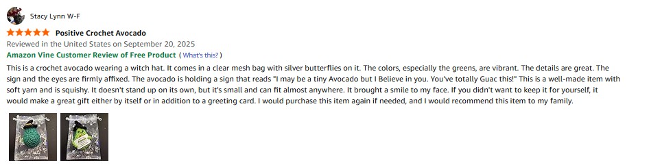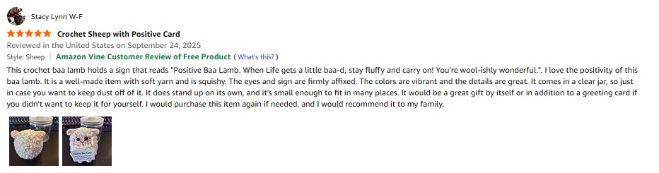 I purchased the Jubilora Mini Highland Cow to My Love, Positive Crochet Animals Cute Things of Desk Decor -I Love You Gifts for Him Her, Highland Cow Stuffed Animal for Couple Girlfriend Boyfriend from Amazon and it was delivered in a timely fashion. This is a really cute crochet highland cow. This item is well-made with nice stitching, details, and soft yarn. It's squishy and the sign and eyes are firmly affixed. The colors are vibrant. It stands up on it's own but not very well. It can be easily knocked over. It comes in a clear mesh bag. It's small enough that it can fit or be propped up anywhere. This highland cow brought a smile to my face. I especially like the sign it's holding. The sign reads "I love you to the MOO-N and back! Tiny highland cow is here to always remind you!" If you didn't want to keep this item for yourself, it would make a great gift either by itself or in addition to a greeting card. I would purchase this item again if needed and I would recommend this item to my family. amazon listing.