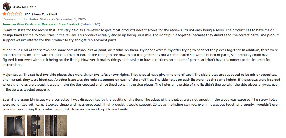 I purchased the Alfrufy 31” Stove Top Shelf , Over the Stove Spice Rack, Wood Space Saving Seasoning Shelf, Kitchen Storage Stand (Black) from Amazon and it was delivered in a timely fashion. I want to state for the record that I try very hard as a reviewer to give most products decent scores for the reviews. It's not easy being a seller. The product has to have major design flaws for me to dock stars in the review. This product actually ended up being unusable. I couldn't put it together because they didn't send the correct parts, and product support wasn't offered for this product to try and get replacement parts.
