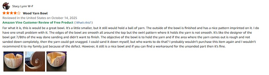 I purchased the LOVEGRASS Wood Yarn Bowl, Knitting Yarn Bowl with Holes, Wooden Yarn Bowl for Crocheting & Knitting Hand Made from Amazon and it was delivered in a timely fashion. For what it is, this is would be a great bowl. It's a little smaller, but it still would hold a ball of yarn. The outside of the bowl is finished and has a nice pattern imprinted on it. I do have one small problem with it. The edges of the bowl are smooth all around the top but the swirl pattern where it holds the yarn is not smooth. It's like the designer of the bowl got 7/8ths of the way done sanding and didn't want to finish. The objective of the bowl is to hold the yarn and if the area where the yarn comes out is rough and not sanded down completely, then the yarn could get snagged. I could sand it down myself, but who wants to do that? I probably wouldn't purchase this item again and I wouldn't recommend it to my family just because of the defect. However, it still is a nice bowl and if you can find a workaround for the unsanded part then it's fine. amazon listing.