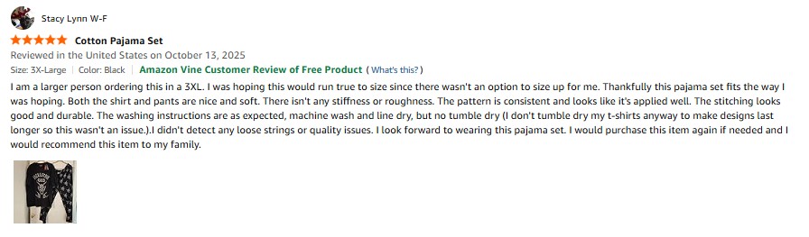 I purchased the Stranger Things Pajama Set for Men, Teens Hellfire Club T Shirt Cotton Pajama Pants Loungewear PJs Sleepwear Gifts for Men from Amazon and it was delivered in a timely fashion. I am a larger person ordering this in a 3XL. I was hoping this would run true to size since there wasn't an option to size up for me. Thankfully this pajama set fits the way I was hoping. Both the shirt and pants are nice and soft. There isn't any stiffness or roughness. The pattern is consistent and looks like it's applied well. The stitching looks good and durable. The washing instructions are as expected, machine wash and line dry, but no tumble dry (I don't tumble dry my t-shirts anyway to make designs last longer so this wasn't an issue.).I didn't detect any loose strings or quality issues. I look forward to wearing this pajama set. I would purchase this item again if needed and I would recommend this item to my family. amazon listing.