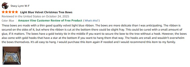 I purchased the weehermont Velvet Christmas Tree Bows – 24 Pcs Holiday Bows (3/8" Wide, 5x7) with Star Clips – Easy Hanging for Tree, Wreath, Gifts & Décor (Blue) from Amazon and it was delivered in a timely fashion. These bows are made with a thin good quality velvet light blue ribbon. The bows are more delicate than I was anticipating. The ribbon is secured on the sides of it, but where the ribbon is cut at the bottom there could be slight fray. This could be cured with a small amount of glue, if it matters. The bows have a gold twisty tie in the middle if you want to secure the bow to the tree without a hook. However, the bows also come with gold hooks that have a star at the bottom if you want to hang them that way. The hooks are small and wouldn't overwhelm the bows themselves. It's all easy to hang. I would purchase this item again if needed and I would recommend this item to my family. amazon listing.