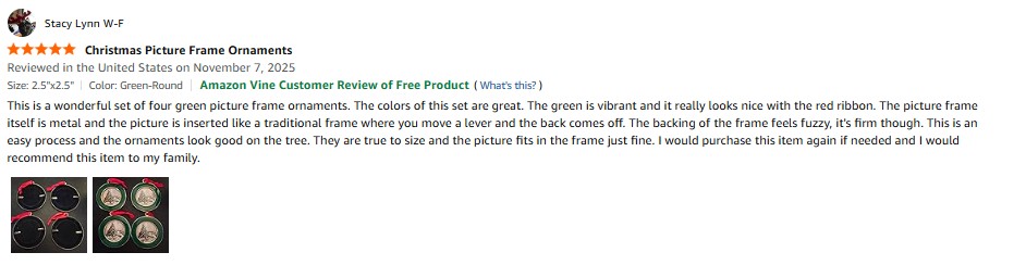 I purchased the ACHAVINM Christmas Picture Frame Ornaments - Set of 4 Green 2.5x2.5 Inch Mini Frames with Red Ribbon, Metal Photo Frames for Christmas Tree Decorations, Holiday Gift for Family & Friends from Amazon and it was delivered in a timely fashion. This is a wonderful set of four green picture frame ornaments. The colors of this set are great. The green is vibrant and it really looks nice with the red ribbon. The picture frame itself is metal and the picture is inserted like a traditional frame where you move a lever and the back comes off. The backing of the frame feels fuzzy, it's firm though. This is an easy process and the ornaments look good on the tree. They are true to size and the picture fits in the frame just fine. I would purchase this item again if needed and I would recommend this item to my family. amazon listing.