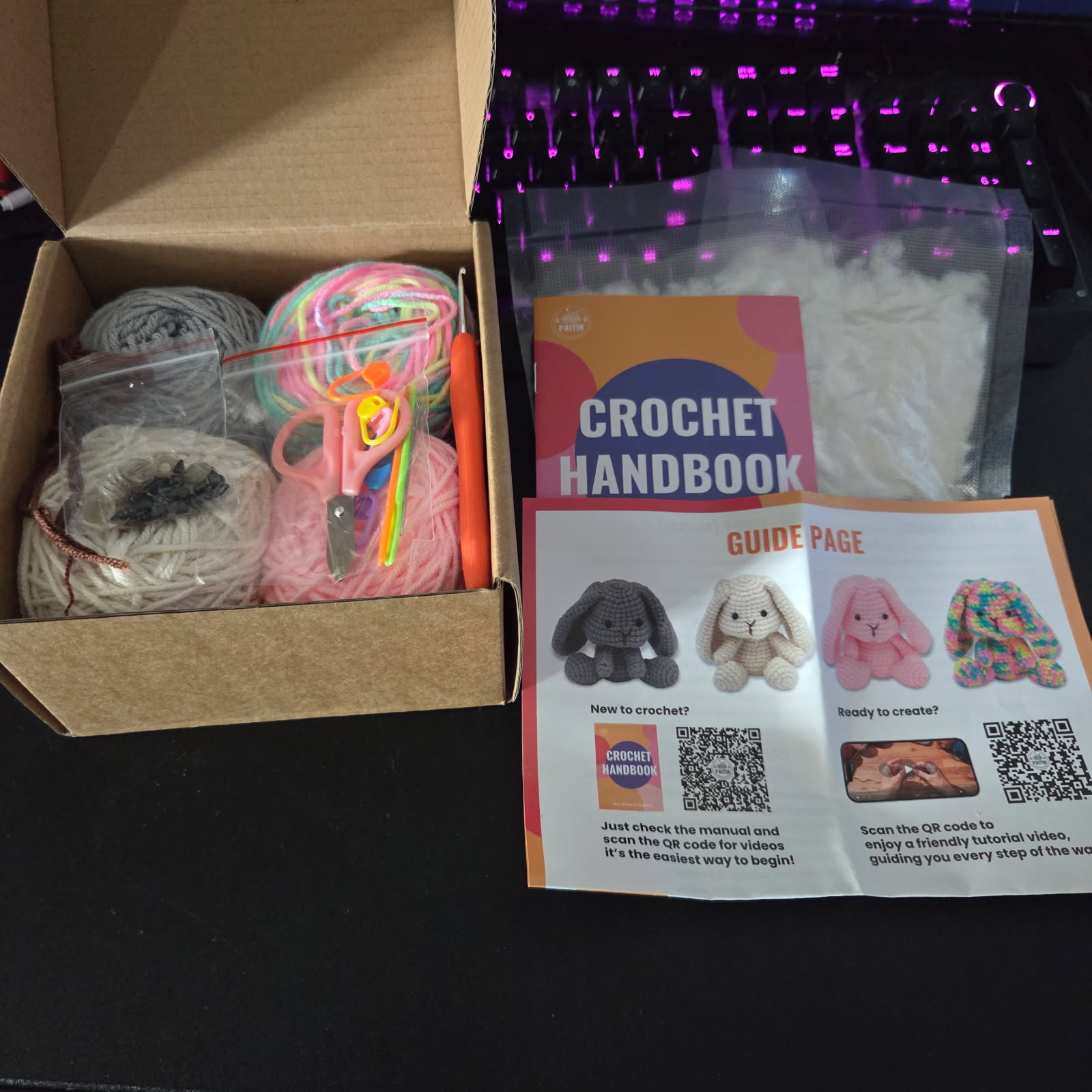 I purchased the PAITIN Crochet Kit for Beginners – DIY Bunny Amigurumi Crochet Kit for Adults & Kids, Easy Crochet Animal Kit with Video Tutorials, Beginner Handbook and All Materials Included, Great Craft Gift Idea from Amazon and it was delivered in a timely fashion. This is a complete kit for all skill levels. There are four balls of yarn, stitch markers, a crochet hook, eyes, threader, scissors, yarn needles, and stuffing. I particularly like the rabbit with the multicolor. I love patterns of floppy eared rabbits. I think they are adorable. There is a booklet explaining the stitches with pictures. There is a QR code that leads to a website with a YouTube channel if you need more help with the stitch or pattern instruction. There is a guide paper with the pattern on it. The pattern itself could use more pictures, but there are the instructional videos in compensation. There also could be a website instead of just a QR code on the papers, but it's a minor detail. The yarn is nice quality and it looks like there should be enough of it. This crochet kit should give a fantastic and relatively quick sense of completion after completing the pattern. I would purchase this item again if needed and I would recommend this item to my family. amazon listing.