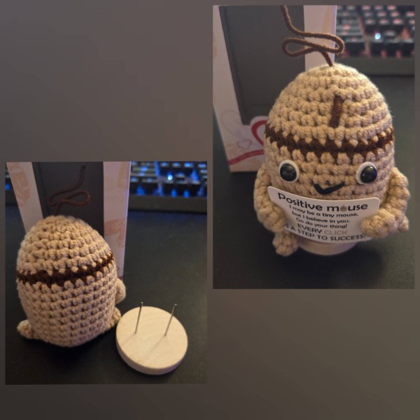 I purchased the BigNoseDeer Positive Crochet Mouse Birthday Christmas White Elephant Gag Gifts for Women Coworker Men Funny Emotional Inspirational Support Cute Stuff Office Desk Decor Kawaii Desk Accessories Stocking Stuffer from Amazon and it was delivered in a timely fashion. This is a cute, little, positive crochet computer mouse. The computer mouse holds a sign that reads "Positive Mouse. I may be a tiny mouse, but I believe in you. Go do your thing! Every CLICK is a step to success!" The crochet computer mouse is well-made with tight stitching, vibrant coloring, soft yarn, and is squishy. The sign and eyes are firmly affixed. The crochet computer mouse does stand up on it's own, kind of, but comes with a stand for it to be displayed on. The stand component has two sharp points on it, but otherwise is fine. The crochet computer mouse is small enough to fix anywhere. The crochet computer mouse comes in a cardboard box. My favorite part of this crochet computer mouse is just the overall funny vibe. Usually the positive crochet items are animals and such, but the fact that it's a computer mouse rather than a real mouse adds a funny element. If you don't want to keep this item for yourself, the crochet computer mouse would make a great gift either by itself or in addition to a greeting card. I would purchase this item again if needed and I would recommend this item to my family. amazon listing.
