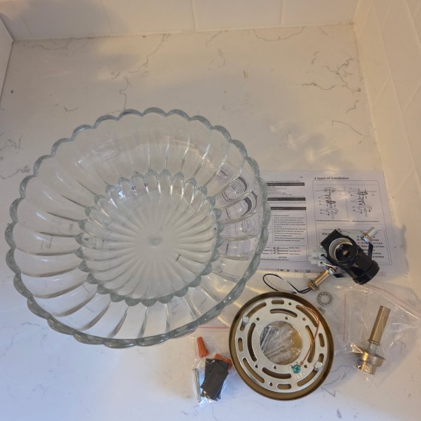 I purchased the Giawosth Semi Flush Mount Ceiling Light ,11.8 Inch Vintage Clear Crystal Glass Ceiling Light Fixture, Dining Room Lighting Fixtures Ceiling for Kitchen Hallway Porch Bedroom Bathroom,E26 Base(Bulb Not Included) from Amazon and it was delivered in a timely fashion. I am in the process of trying to inexpensively as possible update our condo a little bit. I figured changing the light fixtures was one way of doing this. When I received this box, I noticed it was a little heavier than the other lights I have acquired thus far. When I opened it up, the glass shade part is super thick and rather heavy. Other than the heaviness of the glass shade itself, the light comes with the same parts as the other lights. It comes with instructions, the glass shade, the center part that holds the bulb and wires, and the screws/bracket mount. The instructions are very detailed with pictures and look standard to most lights of this type. Bulbs aren't included, but it does state that in the listing. The light looks very nice and I am looking forward to when it is installed. I would purchase this item again if needed and I would recommend this item to my family. amazon listing.