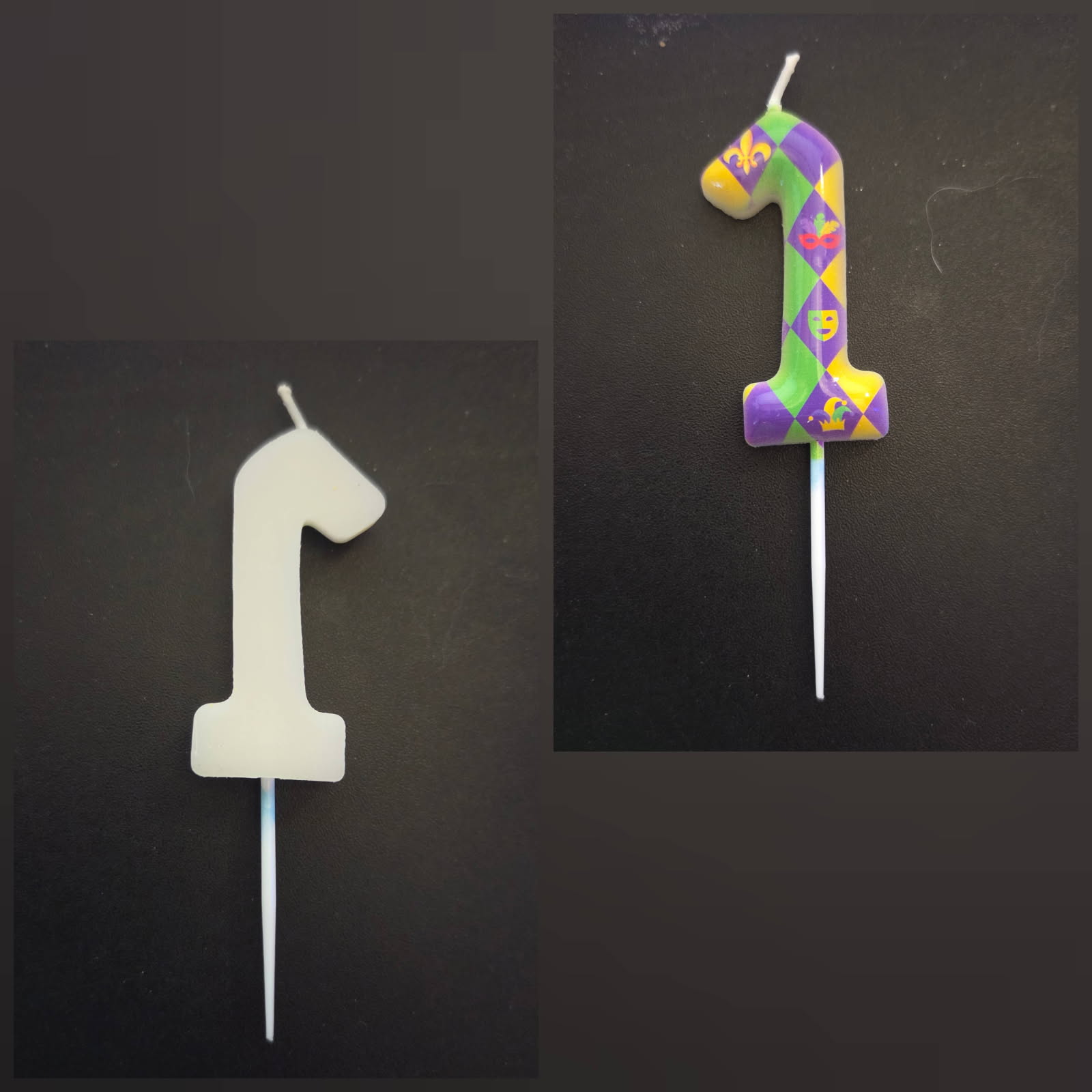 I purchased the HCCYENLAN Carnival Birthday Candles , Number 1 Candle Cake Decorations, Birthday Party Decorations, Family Prayer Candles, Banquet Celebration Party Supplies (Number 1) from Amazon and it was delivered in a timely fashion. This candle is not as thick, big, and blocky as the more traditional numbered candles you see in some of the stores. This candle is closer in style to the thinner, straighter candles that are made. The candle is about 2" high and like a half inch thick. The toothpick is another 2" high, so 4" in length if you count the toothpick too. This candle is multi-colored with yellow, purple, green, and red hues. When I looked at the listing, I was hoping that the candle would be just as brightly colored and have a sharp, clear pattern like the listing picture. The candle I received had the same pattern, but it had more muted colors and was a little bit less sharp and crisp with the design edges. The difference for me is fine, since there isn't that much expectation on one candle. Each color section looks like a portion of a mardi gras carnival theme. The candle sticks into the cake with a toothpick at the bottom. The wick is the standard type on the top. The number one itself is very clearly defined and looks like a one. It burns just fine. If you need a one candle that's in a mardi gras carnival theme, this candle would be a valid choice. I would purchase this item again if needed and I would recommend this item to my family. amazon listing.