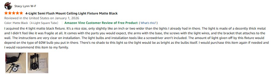 I purchased the Phaosio 4-Light Semi Flush Mount Ceiling Light Fixture , Black Sputnik Modern Farmhouse Close to Ceiling Chandelier Lighting for Bedroom, Dining Room, Kitchen, Living Room, Matte Black E26 Base from Amazon and it was delivered in a timely fashion. I acquired the 4 light matte black fixture. It's a nice size, only slightly like an inch or two wider than the lights I already had in there. The light is made of a decently thick metal and I didn't feel like it was fragile at all. It comes with the parts you would expect, the arms with the base, the screws with the light wires, and the bracket that attaches to the wall. The instructions are very clear on installation. The light bulbs and installation tools like a screwdriver aren't included. The amount of light given off by this fixture would depend on the type of 60W bulb you put in there. There's no shade to this light so the light would be as bright as the bulbs itself. I would purchase this item again if needed and I would recommend this item to my family. amazon listing.